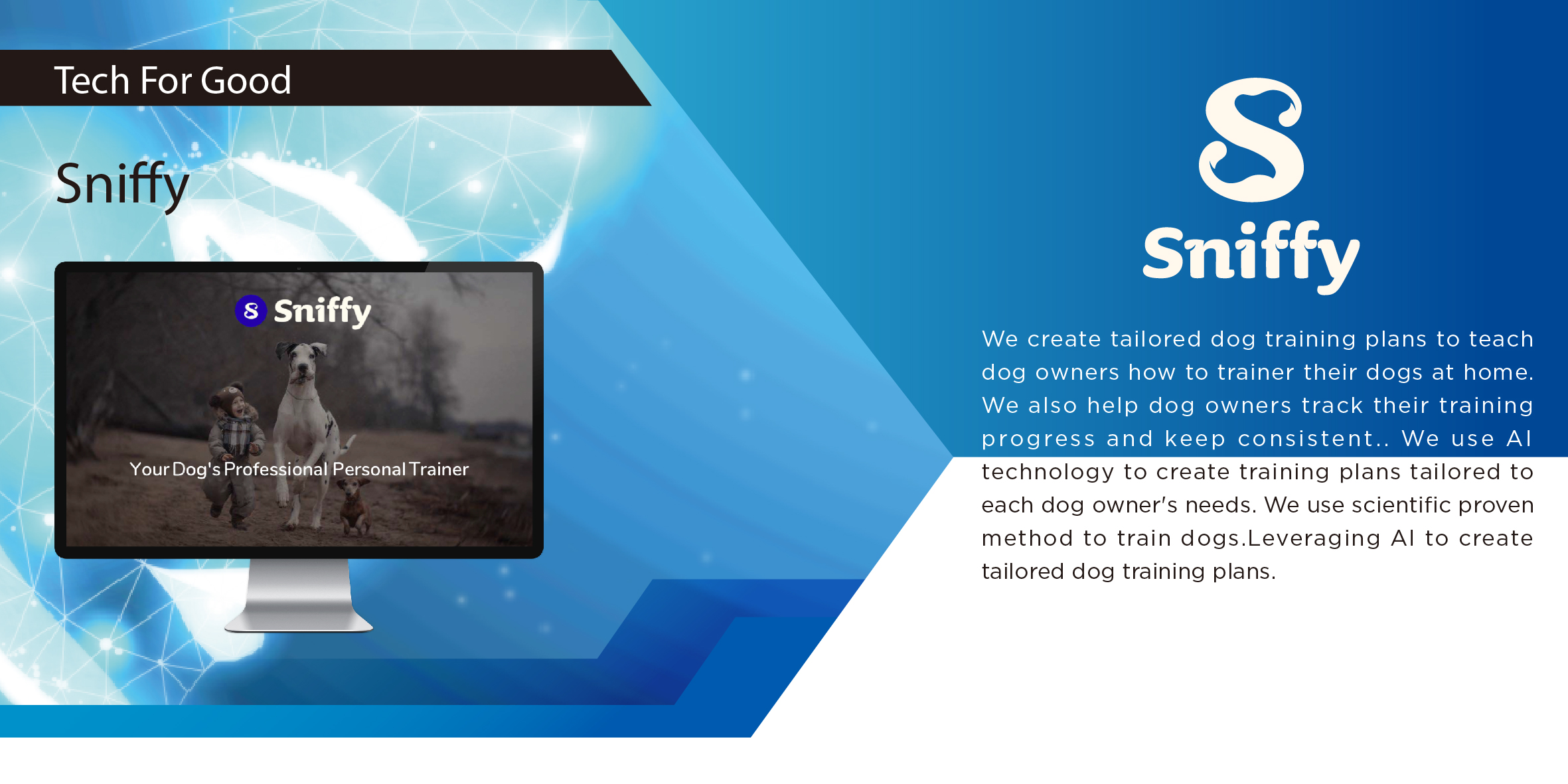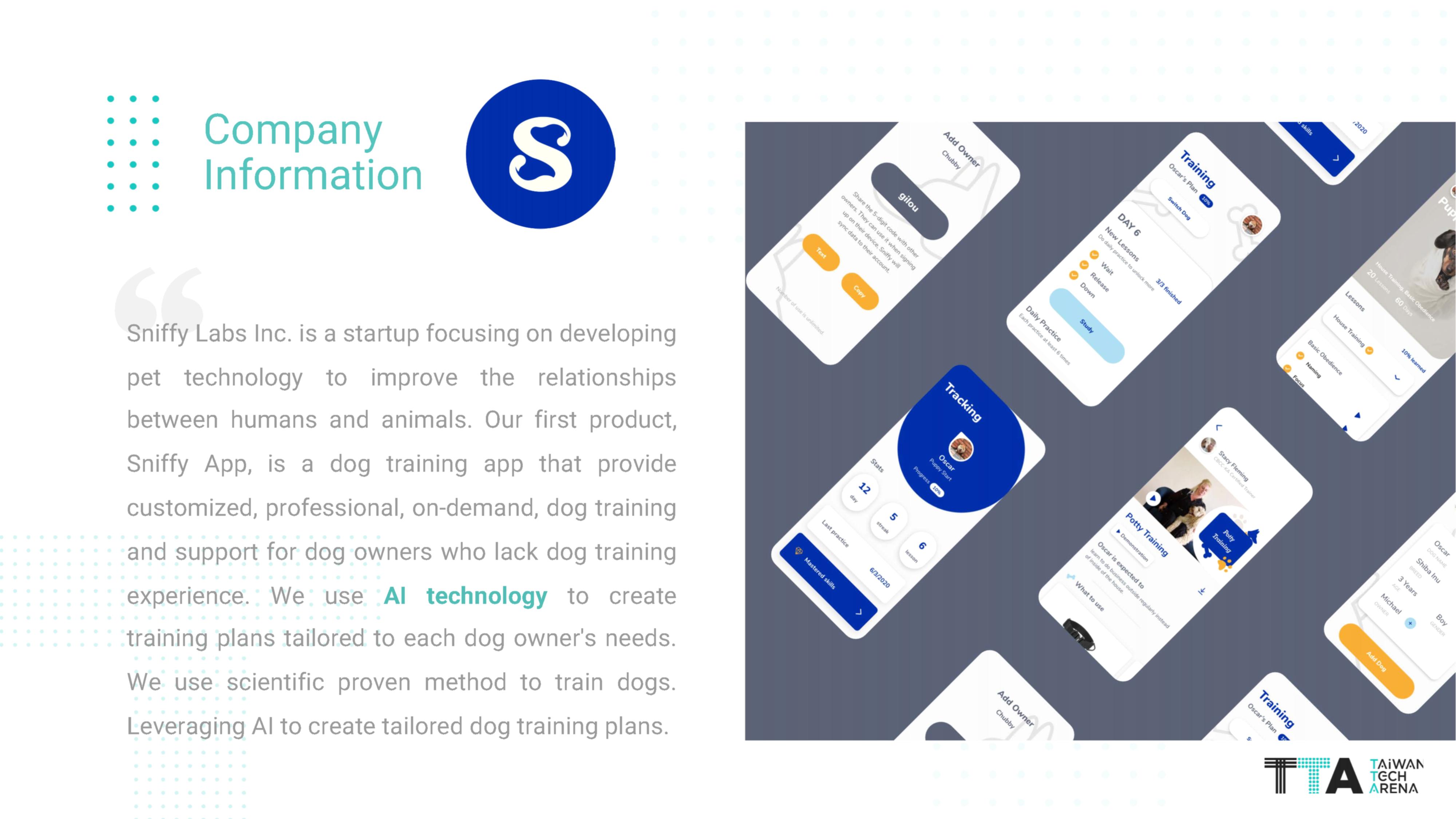 Sniffy Labs Inc. is a startup focusing on developing pet technology to improve the relationships between humans and animals. Our first product, Sniffy App, is a dog training app that provide customized, professional, on-demand, dog training and support for dog owners who lack dog training experience.