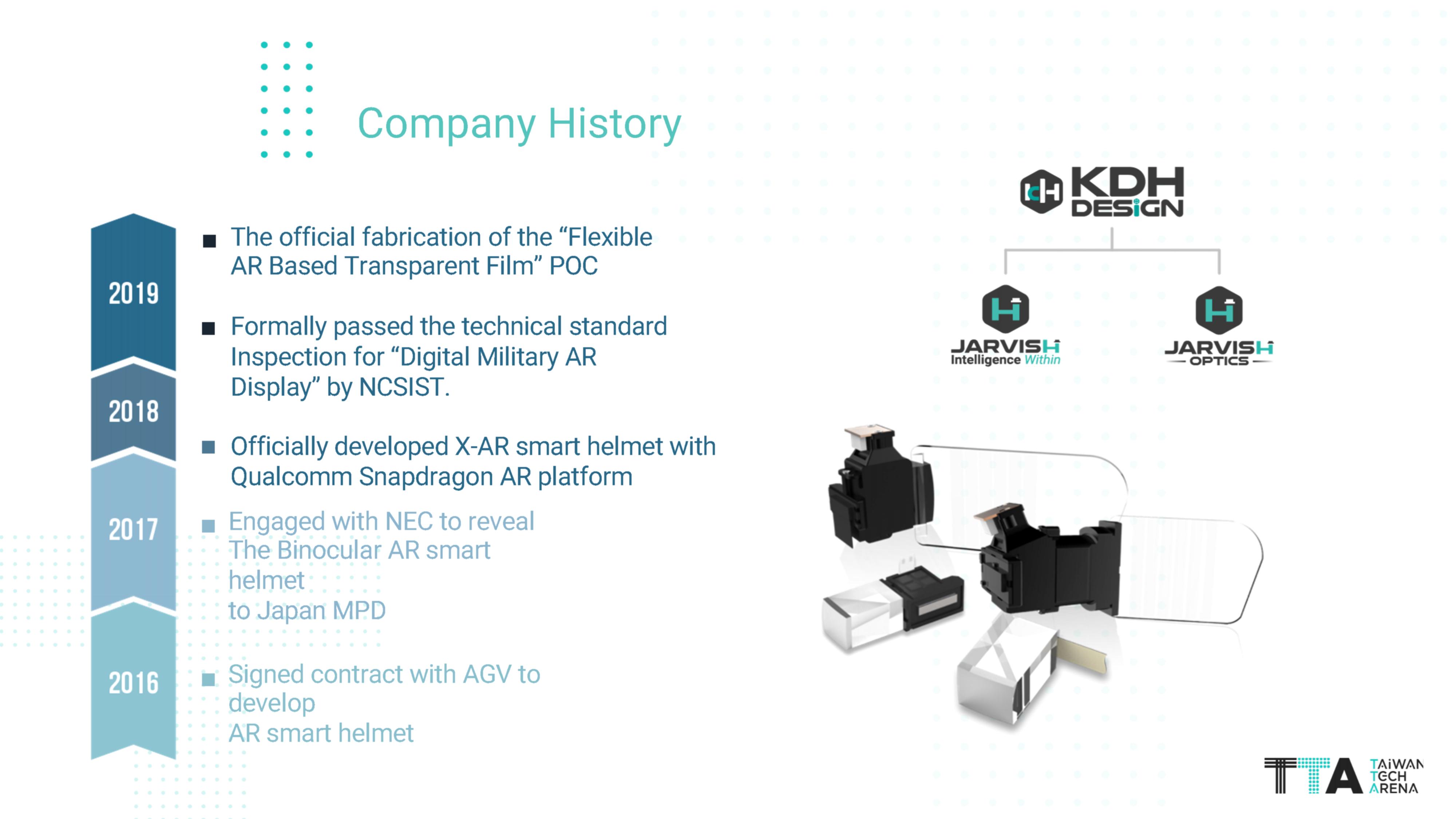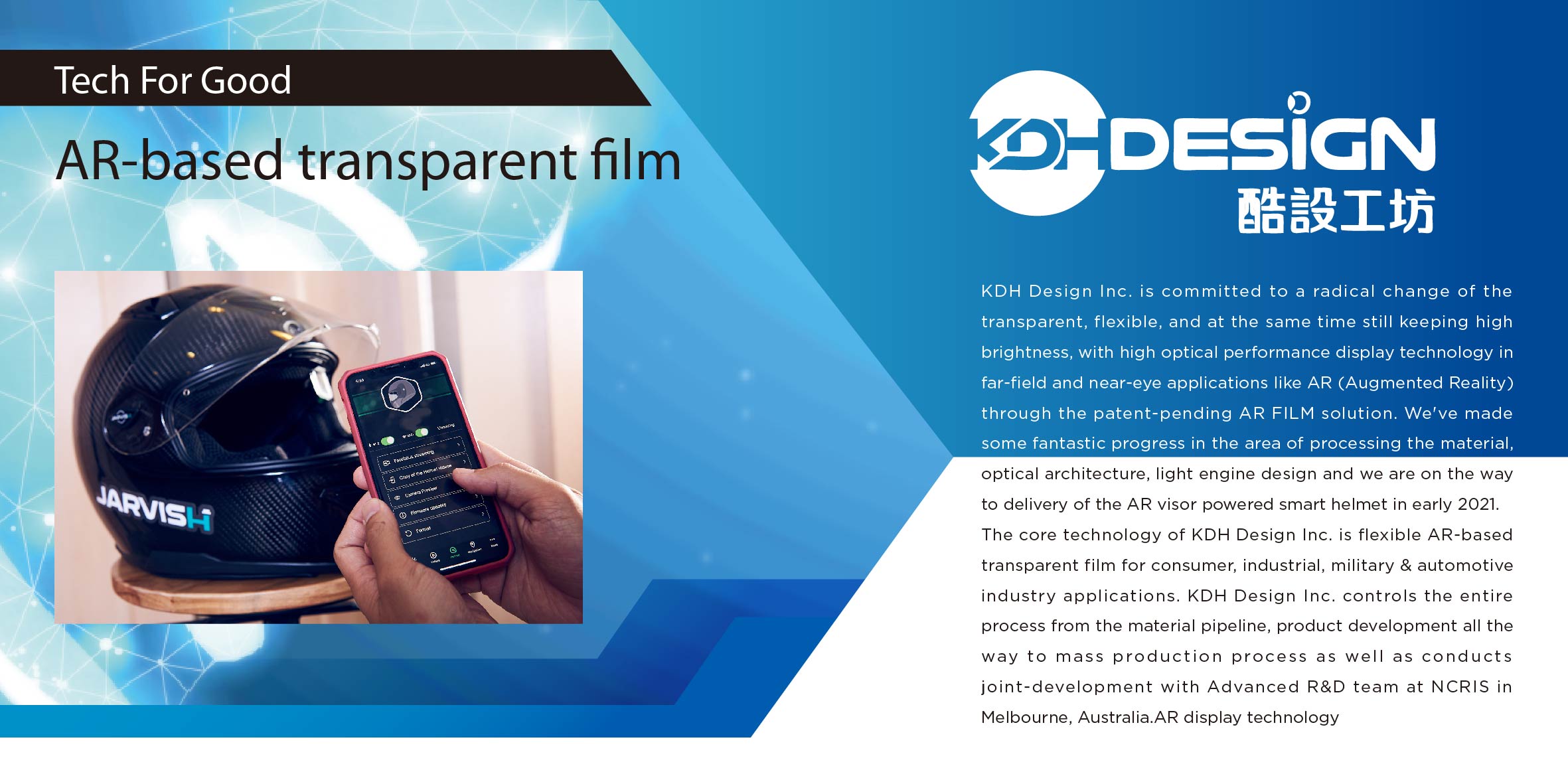 KDH Design Inc. is committed to a radical change of the transparent, flexible, and at the same time still keeping high brightness, with high optical performance display technology in far-field and near-eye applications like AR (Augmented Reality) through the patent-pending AR FILM solution. We've made some fantastic progress in the area of processing the material, optical architecture, light engine design and we are on the way to delivery of the AR visor powered smart helmet in early 2021.