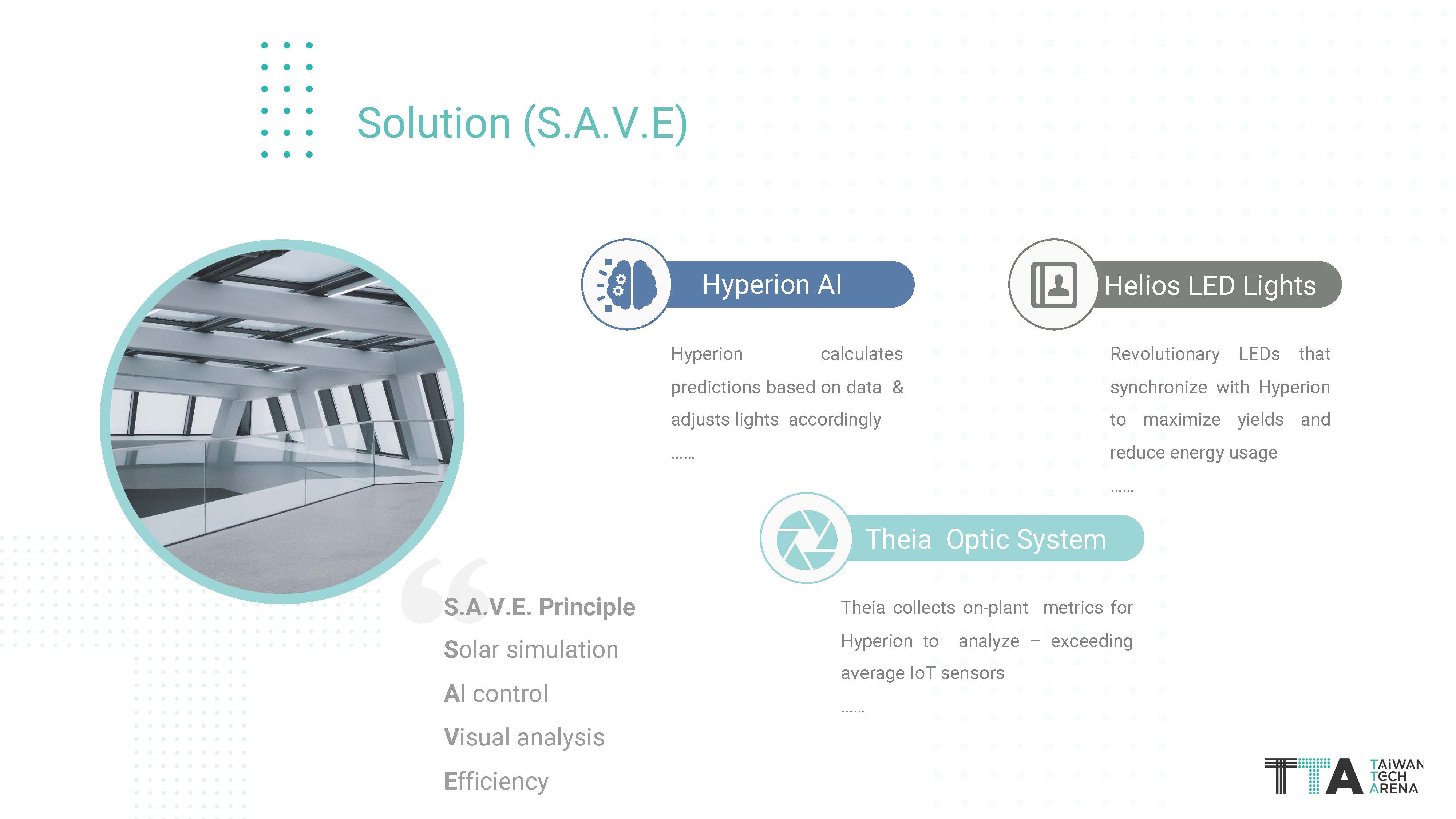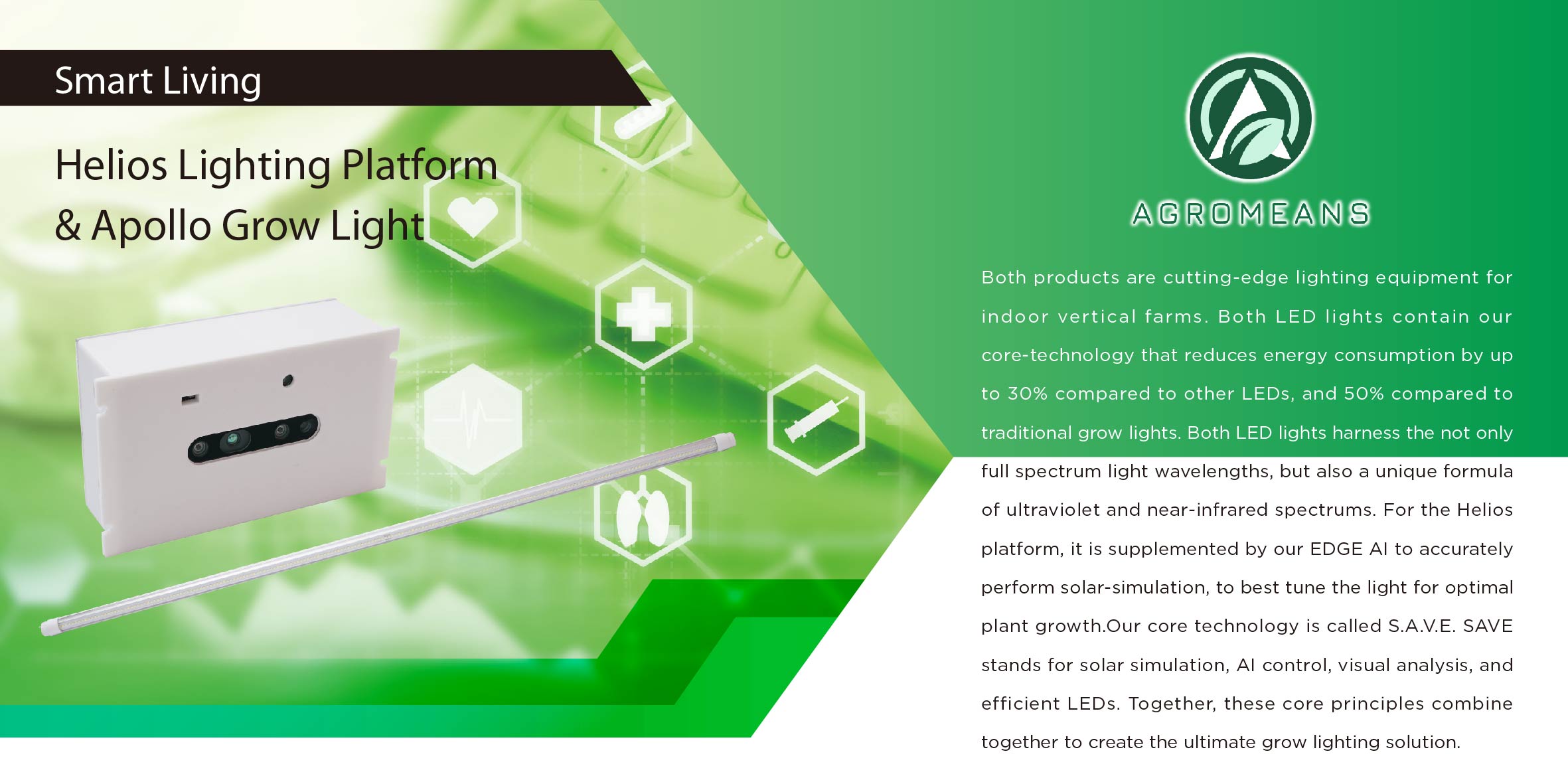 Both products are cutting-edge lighting equipment for indoor vertical farms. Both LED lights contain our core-technology that reduces energy consumption by up to 30% compared to other LEDs, and 50% compared to traditional grow lights. Both LED lights harness the not only full spectrum light wavelengths, but also a unique formula of ultraviolet and near-infrared spectrums. For the Helios platform, it is supplemented by our EDGE AI to accurately perform solar-simulation, to best tune the light for optimal plant growth.Our core technology is called S.A.V.E. SAVE stands for solar simulation, AI control, visual analysis, and efficient LEDs. Together, these core principles combine together to create the ultimate grow lighting solution.