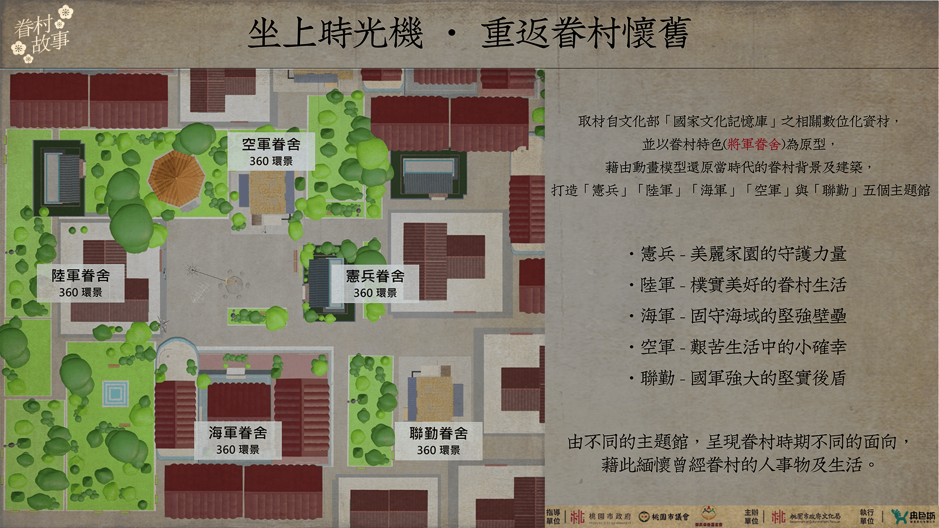 本次線上展覽《坐上時光機 • 重返眷村懷舊時光》,以文化部「國家文化記憶庫」中的數位典藏資料,復刻各軍種眷村的外型及內部環境,分為「陸軍」、「海軍」、「空軍」、「憲兵」、「聯勤」五個展區。