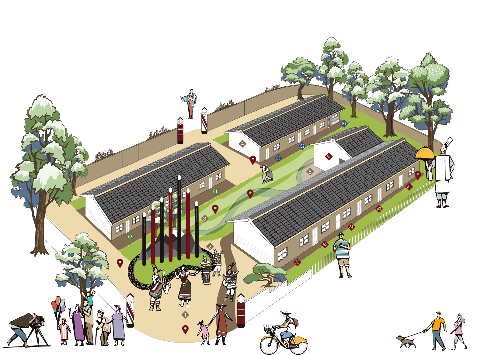 園區整體設計理念以及視覺識別系統,主要以原、流、水、霧等原住民族元素做符號轉化,運用泰雅紋面文化、及聖山大霸尖山為文化脈絡之概念導入;同時以泰雅聞名於世的織布工藝為重要意象,立下經線之柱,亦象徵立地而生的紮根傳統,自由靈動如飄帶鎸刻著民族傳統生活意象及紋面的圖紋,傳遞出創新泰雅文化創意的企圖與深意。另外將大霸尖山陵線設為背景,整體以源流-新創聚落將成為中部原住民文化、產業基地的信念充分傳述,配合水霧、LED光點變化等意象設計,成為園區最醒目的特色,也向聚落的融合與包容開啟了大門。