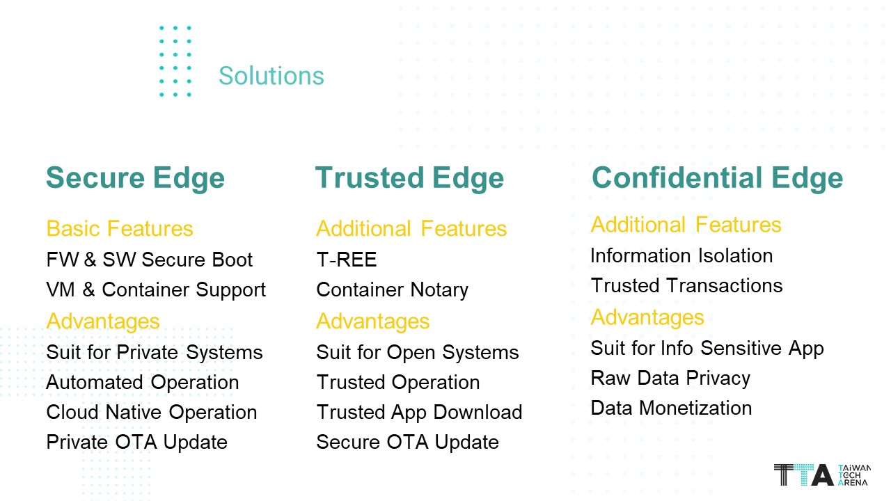 Provide solution to enhance the security level on edge devicesProvide solution from software level to hardware levelTrusted Computing on edge devices for hetergenous computing