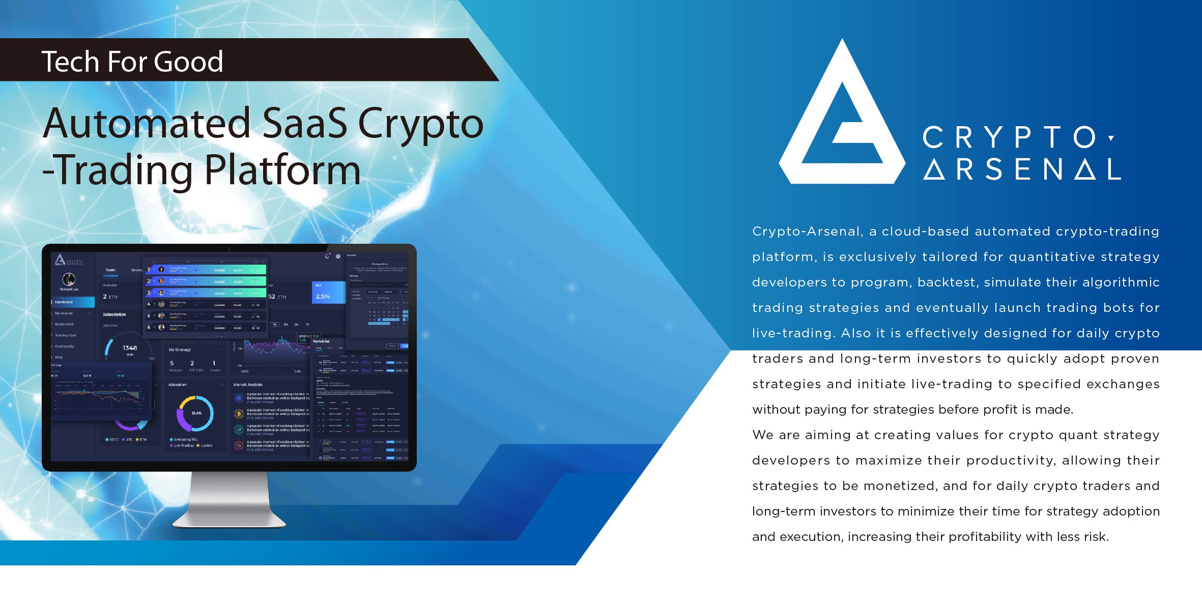 Crypto-Arsenal creates an automated SaaS crypto-trading platform for developers to develop, backtest, simulate, execute and monetize quantitative trading strategies, and for traders to adopt verified strategies for live-trading with Split-As-You-Profit Model.