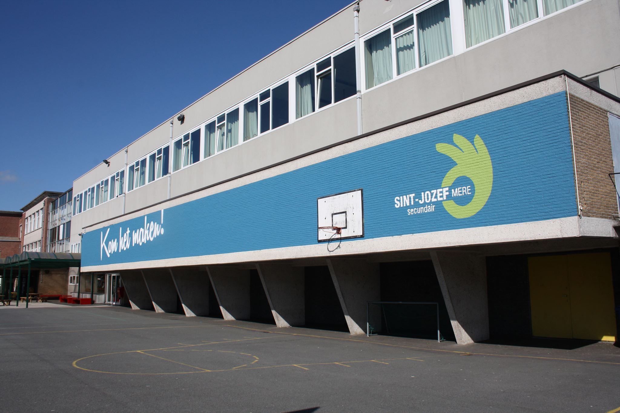 Hier staat Mevrouw Van De Velde steeds paraat om iedereen welkom te heten. Ze verschaft ook de nodige informatie over de buitenschoolse sportactiviteiten en leerlingen kunnen bij haar terecht om een voetbal te lenen tijdens de speeltijd.