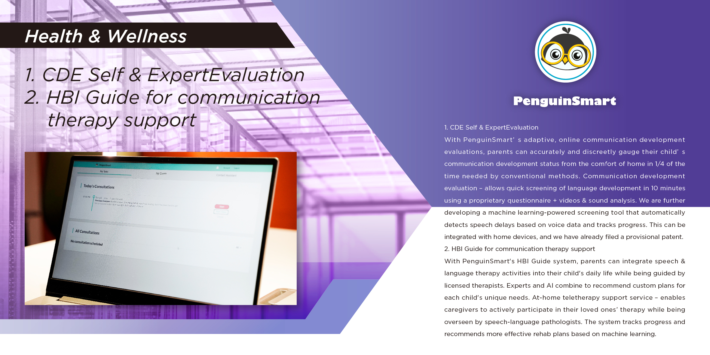 "With PenguinSmart’s adaptive, online communication development evaluations, parents can accurately and discreetly gauge their child’s communication development status from the comfort of home in 1/4 of the time needed by conventional methods. Communication development evaluation – allows quick screening of language development in 10 minutes using a proprietary questionnaire + videos & sound analysis.