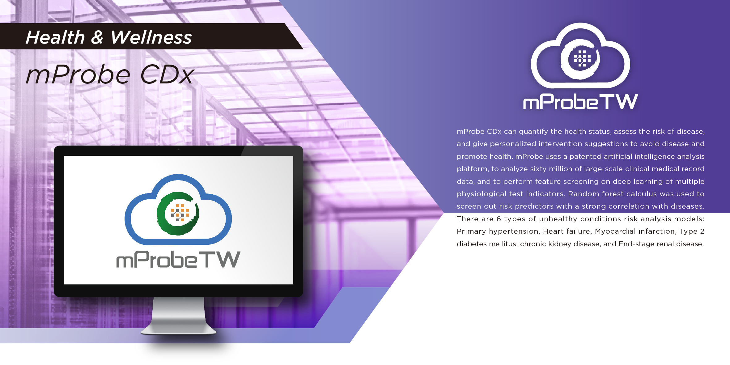 mProbe CDx can quantify the health status, assess the risk of disease, and give personalized intervention suggestions to avoid disease and promote health. mProbe uses a patented artificial intelligence analysis platform, to analyze sixty million of large-scale clinical medical record data, and to perform feature screening on deep learning of multiple physiological test indicators. Random forest calculus was used to screen out risk predictors with a strong correlation with diseases. There are 6 types of unhealthy conditions risk analysis models: Primary hypertension, Heart failure, Myocardial infarction, Type 2 diabetes mellitus, chronic kidney disease, and End-stage renal disease.